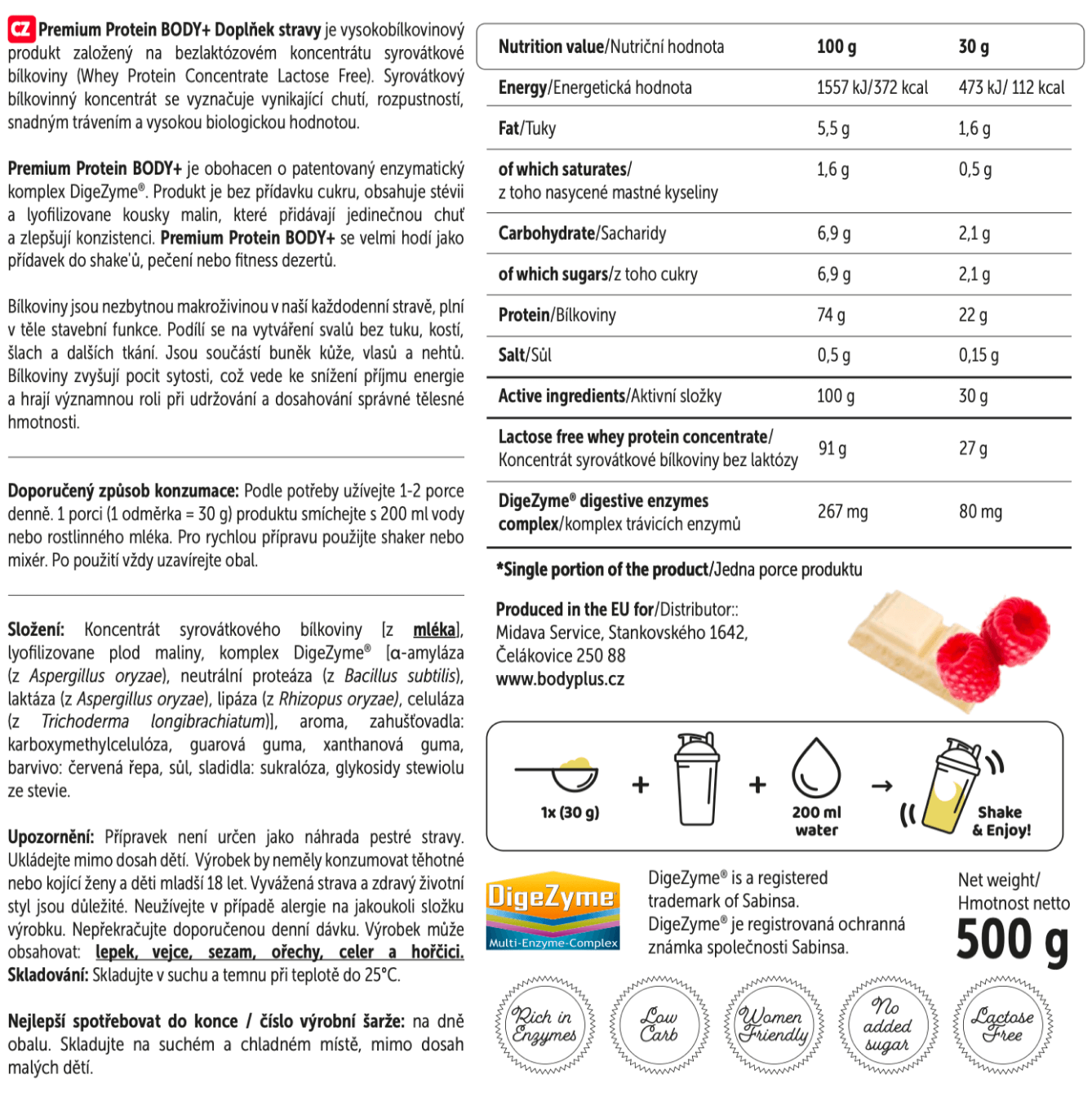 Premium Protein BODY+ je obohacen o patentovaný enzymatický komplex DigeZyme®. Produkt je bez přídavku cukru, obsahuje stévii a liofilizované kousky malin, které přidávají jedinečnou chuť a zlepšují konzistenci. Premium Protein BODY+ se velmi hodí jako přídavek do shake'ů, pečení nebo fitness dezertů.