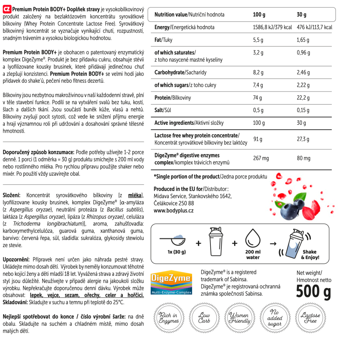 Premium Protein BODY+ je obohacen o patentovaný enzymatický komplex DigeZyme®. Produkt je bez přídavku cukru, obsahuje stévii a lyofilizovane kousky brusinek/ borůvek, které přidávají jedinečnou chuť a zlepšují konzistenci. Premium Protein BODY+ se velmi hodí jako přídavek do shake'ů, pečení nebo fitness dezertů.