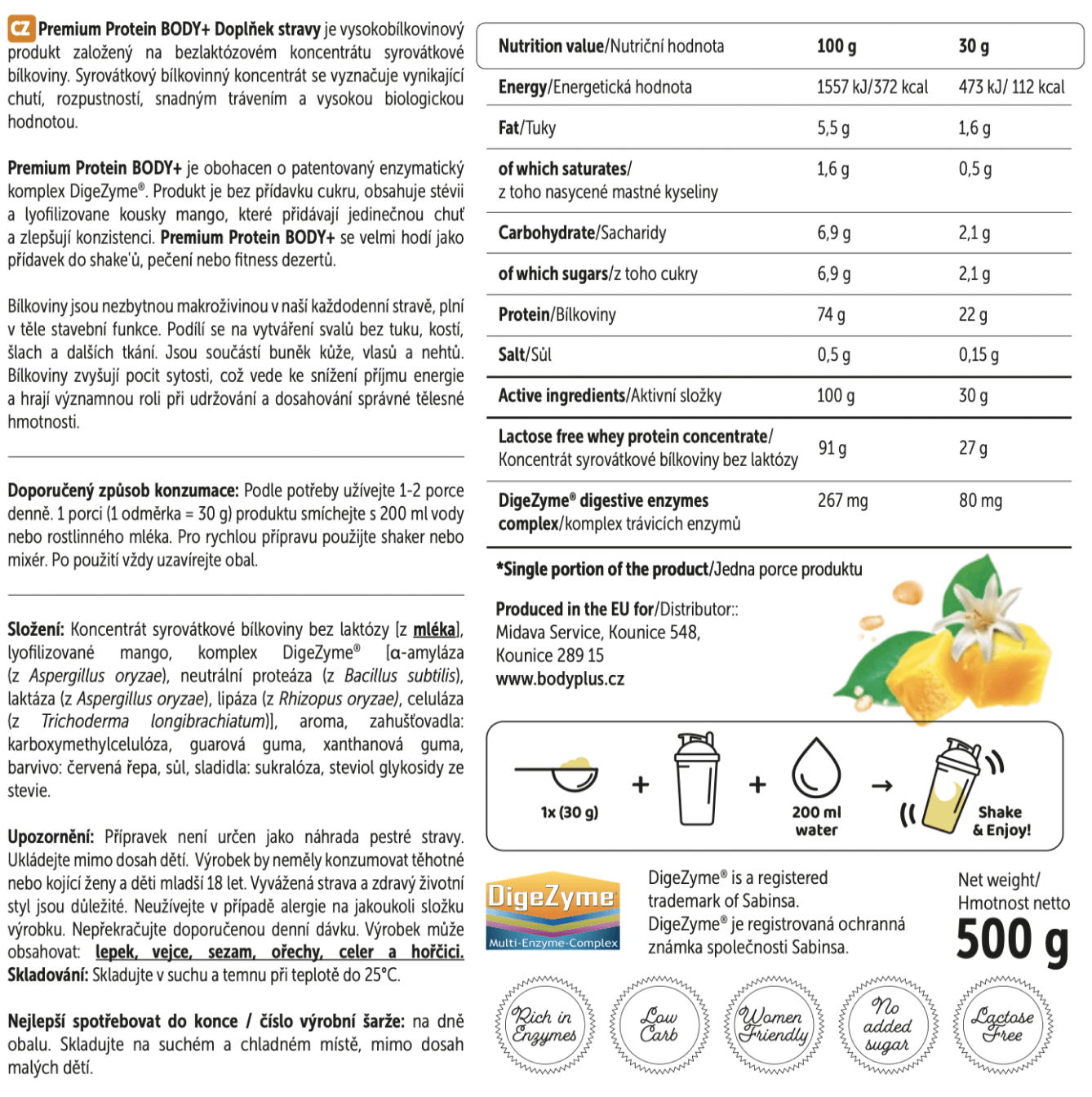 Premium Protein BODY+ je obohacen o patentovaný enzymatický komplex DigeZyme®. Produkt je bez přídavku cukru, obsahuje stévii a lyofilizovane kousky manga, které přidávají jedinečnou chuť a zlepšují konzistenci. Premium Protein BODY+ se velmi hodí jako přídavek do shake'ů, pečení nebo fitness dezertů.