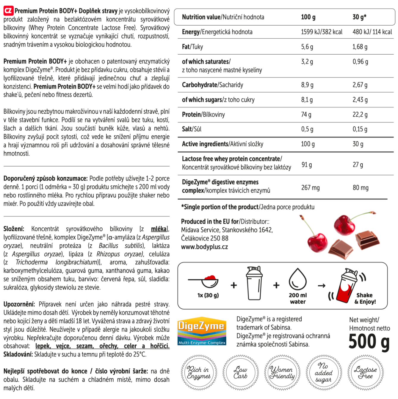CZ Premium Protein BODY+ Doplňek stravy je vysokobílkovinový produkt založený na bezlaktózovém koncentrátu syrovátkové bílkoviny (Whey Protein Concentrate Lactose Free). Syrovátkový bílkovinný koncentrát se vyznačuje vynikající chutí, rozpustností, snadným trávením a vysokou biologickou hodnotou.